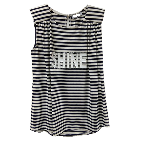 Γυναικεία μπλούζα χωρίς μανίκια που είναι ελαφρώς ασύμμετρη ριγέ. Μπροστά στο στήθος έχει στάμπα με το λογότυπο της εταιρείας διακοσμημένο με strass.